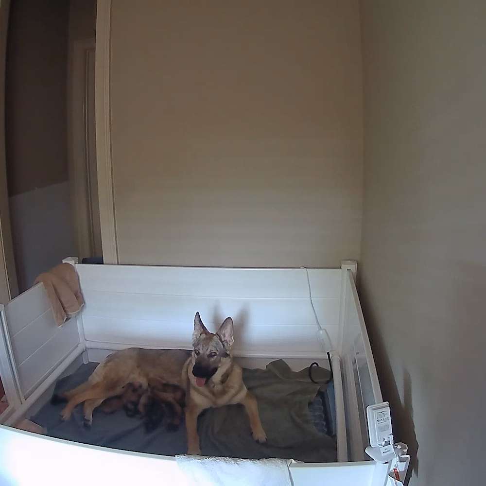 It has been quite a week! We thought we would have Nala in the pregnancy stage a little longer but she decided to have her pups on 2 May starting at 1AM. The events leading up to her delivery were very telling of her whelping sooner rather than later. A few days prior, she did not have much interest in her food, she tried nesting everywhere she went to lay down, and she became very very clingy. We started taking her out for even more frequent potty breaks as the pups were moving quite a bit and she clearly needed to go out. On Sunday, 1 May, we took her temperature (no she was not happy about it) and it was 98.7. What?? Did we take that wrong? If it were true, the temperature dropping could be an indicator labor could start within 12-30 hours. Normal temp is 101 – 102.5. It was 3:34 PM and just for the heck of it, I took a picture of it and sent it to a friend (pretty much to say OMG! and I must have taken that wrong). Nala was within her window, but we didn’t expect her to go into labor in the beginning of the window. 1 May was a Sunday. We had taken the day to ensure Nala’s whelping room was set. All potential emergency supplies were in place, tons of towels, and nanny cams running. Nala was up late (meaning we were up late also), she was very restless and clearly uncomfortable. Around 11:30PM, she was taken to her room where she usually just lays down and sleeps, no issue. But this night, she barked and whined and was very disturbed by being left alone. Nanny cam worked great, she was loud and we heard it. We went and let her come back to our bed where she quickly went into a deep sleep and must have felt safe. Around 1AM, movement at my feet and a loud slurping sound woke me up after just falling asleep 15 minutes prior. Quickly jumping out of bed, we could see Nala delivering her first pup. Family and friends kept laughing and saying she was so pampered she would have her pups on our bed – our response was no way as we watch her like a hawk. Okay, so just one got born on the bed. Thankfully, there was barely any evidence and after she cut the cord, we all took off to the whelping box where we would spend the next 8 hours having puppies. Each pup that came out, I helped with holding back legs, tail, and about an inch of umbilical cord so she could cut it without taking off any important parts in the way. When we went to the Vet for the puppy count x-ray, the Vet told us there were 8-10 pups. Puppy 1 came at 1:03, #2 at 1:14; #3 at 2:08; #4 at 2:54; #5 at 4:09; #6 at 4:44 and #7 at 6:02AM. We waited 3 hours after the last pup and no other pups were born. Around 9AM, we took her for a short walk (keeping towels and supplies in-hand in the event of another delivery). She was done. Very exhausted, very attentive to all her new babies, cleaning them, nursing them and trying to stay awake. We were the same, very exhausted and watchful to ensure she did not lay on one and to make sure everyone was eating and stayed warm. After each pup was born and we went thru the umbilical cutting process, she licked her puppy, we towel dried the pup and quickly got the pup nursing. After drying each pup, they were weighed. Videos were taken of each delivery (some we may show on you tube) We also got the heat up in the room as it was around 75 and we knew they needed to stay warm and recommendations were to keep it around 90 for their first week. Wow, 90 was hot for us and Nala but the pups appeared to appreciate the warmth. During delivery, Nala enjoyed ice cubes between contractions. She also just wanted to eat ice cubes the next day. She started eating wet food again on day #2 and each day she ate more. On day 3, she was ready to throw all unnecessary towels and blankets out of her whelping box. She even decided to bite a hole in the towel wrapped heating pad causing us to go to a heating lamp.
